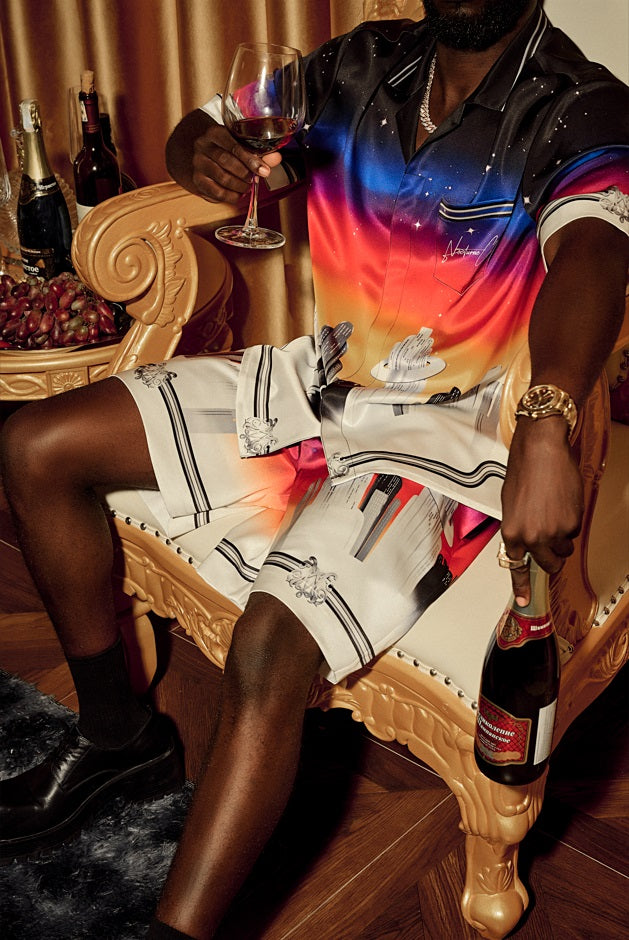 Lucky-K Silk Shorts | Printed Silk Relaxed Camp Collar Midnight Dice Checkerboard